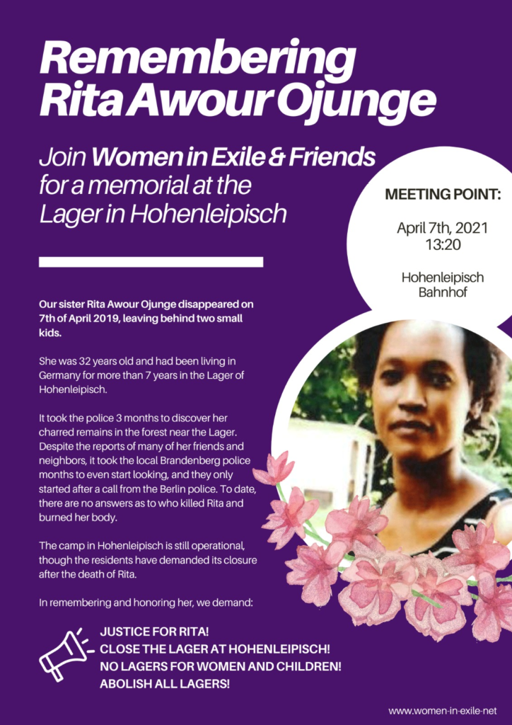 On April 7th, 2019, our sister Rita Ojunge disappeared. Rita was living with her children in a Lager for refugees in Hohenleipisch, Brandenburg. After her disappearance, Rita’s family wanted to know what had happened. The refugees living in her Lager demanded justice for Rita and the closing of the Lager – which is still in very bad condition and absolutely isolated, surrounded by a forest.