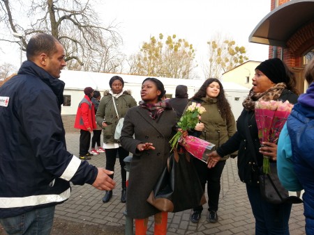 Gemeinsam mit 20 Frauen haben wir mit vier Bussen drei Flüchtlingslager in Brandenburg besucht, um dort den Frauen Rosen und Flyer zu überreichen und sie einzuladen mit uns gemeinsam auf Tour zu gehen. Zum Auftakt organisierte die Asylberatung Henningsdorf dort ein Treffen und wir frühstückten alle gemeinsam mit einigen Freundinnen von Refugee Emancipation im Nachbarschaftstreff Stolpe- Süd. Zum 8. März machen wir gemeinsam deutlich: